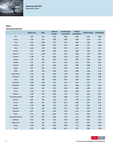 وفي مؤشر الديمقراطية العالمي 2013، الذي أصدرته العام الماضي وحدة البحوث والمعلومات التابعة لمجلة الإيكونوميست البريطانية EIU، احتلت البحرين المرتبة 146 من بين 167 دولة، لتجدد مكانها بين الدول المتسلّطة (المستبدة) في العالم في ذيل القائمة، وصنّف الإيكونومست النظام في البحرين على أنه من "الملكيات المطلقة".