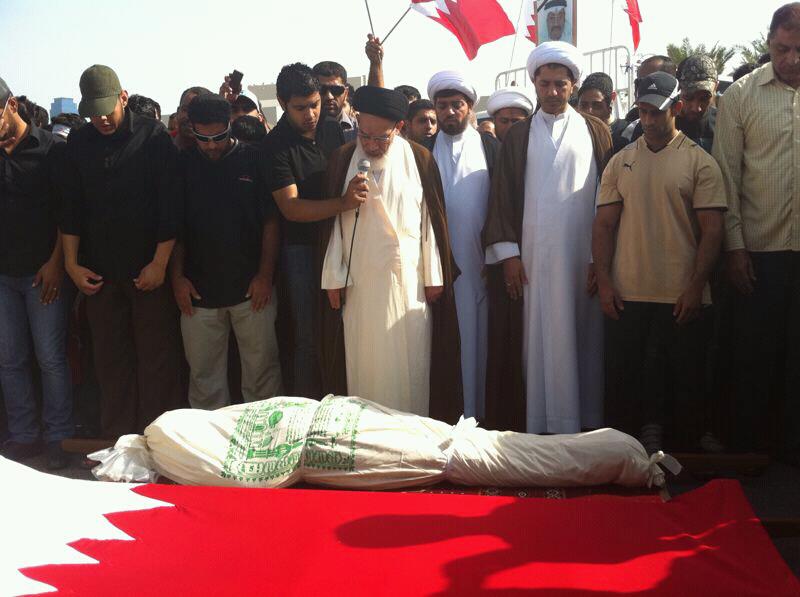 وانطلقت مسيرة التشييع من مسجد الشيخ إبراهيم بمنطقة جدحفص المحاذية إلى مسقط رأس المتوفى، وهي الديه. وأدى رجل الدين السيد سعيد الوداعي مراسم الصلاة عليه، في حين تصدر مسيرة التشييع التي استغرقت نحو الساعة والنصف أمين عام جمعية الوفاق الشيخ علي سلمان والناشط الحقوقي رئيس مركز البحرين لحقوق الإنسان نبيل رجب.