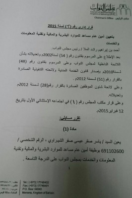وإثر هذا التوجه أصدر رئيس مجلس النواب الحالي أحمد الملا اليوم الخميس 12 فبراير/شباط 2015، قراره الإداري رقم 3 لعام 2015، نص على تعيين أمين عام مساعد للموارد البشرية والمالية وتقنية المعلومات والخدمات، وتقرر في المادة الأولى تعيين عضو المؤسسة الوطنية لحقوق الإنسان ياسر عيسى صقر الشيراوي.