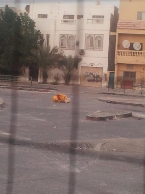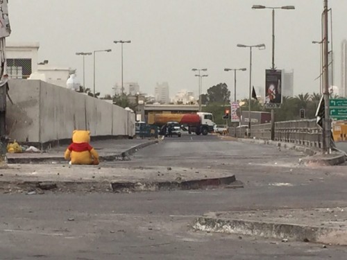 وشوهد "الدب الدرازي" مفترشاً الأرض أمام أحد الحواجز التي عمد المحتجون على نشرها في الطرقات الداخلية واستخدمت فيها حاوية للمخلفات.