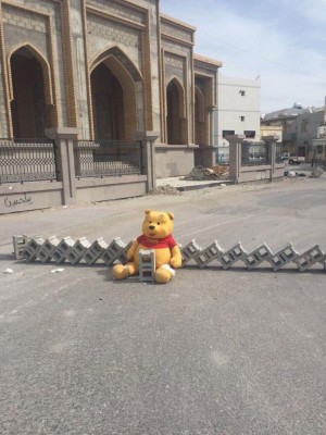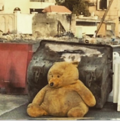 "دب البلاد القديم" ذو اللون الأصفر المعقود بياقة حمراء كانت له قصة مأساوية. فقد قام محتجون بوضعه حارساً على أحد الحواجز المصنوعة من الطوب في أحد زقاقات القرية. وقد أظهرته الصور، وهو يحتضن طوبة كاشفاً عن ابتسامة خفية ساخرة.