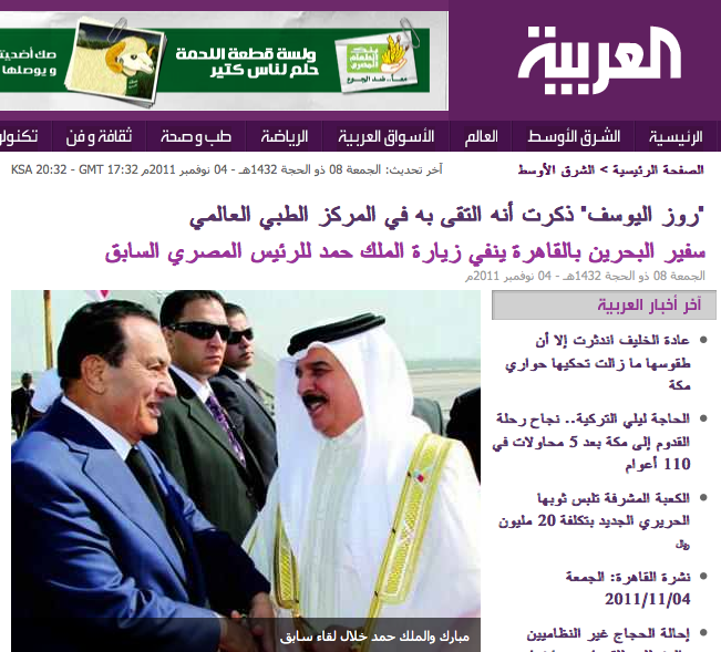 مرآة البحرين: أوردت قناة العربية السعودية نفياً على لسان السفير البحريني في القاهرة لخبر لقاء الملك حمد بن عيسى آل خليفة بالرئيس المصري المخلوع حسني مبارك في في محبسه بالمركز الطبي العالمي. وقال راشد آل خليفة في تصريح للقناة "إن الملك حمد بن عيسى لم يلتق مبارك من قريب أو بعيد منذ تنحية عن الحكم في 11 فبراير/شباط الماضي". وغير موقع "العربية" ديباجة الخبر الذي نشرته عصر اليوم الجمعة بديباجة أخرى أبرزت النفي على لسان السفير.