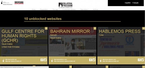 ولمواجهة الرقابة على الإنترنت، جعلت منظمة مراسلون بلا حدود المواقع الإلكترونية التسعة التالية متاحة في 11 دولة بعد أن كانت ممنوعة أو محجوبة فيها. المواقع الإلكترونية هي: Grani.ru (محجوب في روسيا)، Fregananews (محجوب في كازاخستان وأوزباكستان وتركمانستان)، The Tibet Post وMingjing News (محجوبة في الصين)، Dan Lam Bao (محجوب في فيتنام)، Hablemos Press (محجوب في كوبا)، Gooya News (محجوب في إيران)، مركز الخليج لحقوق الإنسان (محجوب في الإمارات العربية المتحدة)، مرآة البحرين (محجوب في البحرين والمملكة العربية السعودية).