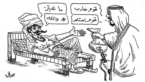The caricature published in Akhabr Al Khalij newspaper affiliated to the Bahraini Prime Minister, Khalifa bin Salman, shows an image for the Saudi king, Salman bin Abdulaziz, holding a bag of money in his one hand and a firearm in his other and giving them to a Pakistani lying down in a bed. In the caricature, the king is represented saying to the Pakistani "Go Fight", while the later answers, "I can't". The king then says, "Take This" referring to the money, the Pakistani replies, "Oh! Really". The dialogue reflects the nature of the Saudi-Pakistani relation, on the government and people level, which build on giving commands in return for money.