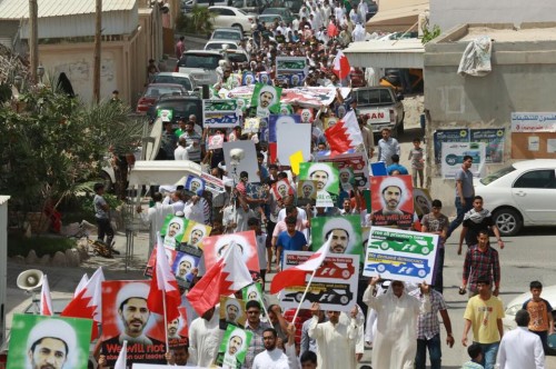 ونادى المتظاهرون بوضع حد لاستحواذ عائلة آل خليفة على السلطة، ورفعوا شعارات تطالب بالإفراج عن أمين عام الوفاق الشيخ علي سلمان ورموز المعارضة السياسية المعتقلين منذ 4 سنوات.