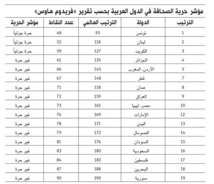 والبحرين كانت الأخيرة خليجياً وفي الترتيب 18 عربياً، قبل سورية التي جاءت في الترتيب الأخير عربياً، فيما احتفظت بالنقاط التي حصلت عليها في العام الماضي، إذ حصلت على 87 من 100 نقطة، وبحسب مؤشر حرية الصحافة الذي تعتمده «فريدوم هاوس»، فإن (ارتفاع النقاط = حرية أقل).