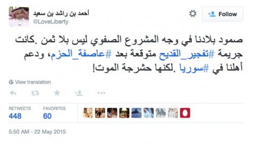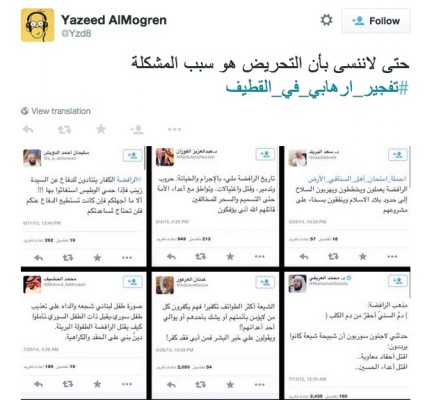 أما المُلفت أكثر في مجزرة القديح فكان تحميل إيران والشيعة مسؤولية ذلك، فقد قال أحمد راشد سعيد وهو أحد حملة الدكتوراة في السياسة من الرياض، إن "صمود بلادنا في وجه المشروع الصفوي ليس بلا ثمن. كانت جريمة تفجير القديح متوقعة بعد عاصفة الحزم، ودعم أهلنا في سوريا. لكنها حشرجة الموت" على حد تعبيره.