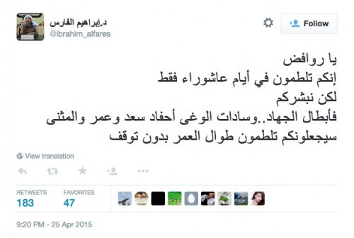 وهكذا قال إبراهيم الفارس الذي عمل كأستاذ جامعي في كلية التربية بجامعة الملك سعود سابقاً، فقد كتب قبل شهر، مهدداً الشيعة بأنهم لن يلطموا "في أيام عاشوراء فقط، لكن نبشركم فأبطال الجهاد وسادات الوغى أحفاد سعد وعمر والمثنى سيجعلونكم تلطمون طوال العمر بدون توقف".