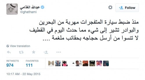 والمُثقّف عبدالله الغذامي أشار إلى أمرٍ مشابه فقال "منذ ضبط سيارة المتفجرات مهربة من البحرين، والبوادر تشير إلى شيء مما حدث اليوم في القطيف، لا تنسوا من أرسل حجاجه بحقائب مُلغمة"، في إشارةً إلى مزاعم سعودية بضبط متفجرات قادمة من البحرين.