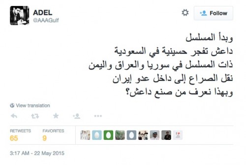 وفي السياق نفسه يذهب عادل عبدالله الذي يرى في نفسه محللاً سياسياً من الطراز الرفيع، يقول إن "تفجير داعش لحسينية في السعودية هو ذات المسلسل في سوريا والعراق واليمن ألا وهو "نقل الصراع إلى داخل عدو إيران، وبهذا نعرف من صنع داعش".