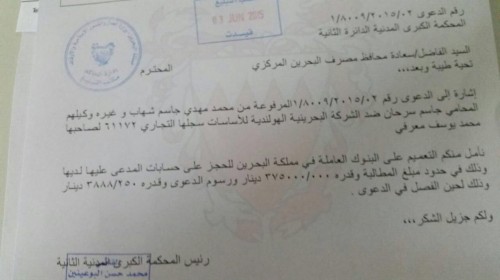 وقام أحد التجّار البحرينيين وهو محمد مهدي جاسم شهاب بتقديم شكوى لدى القضاء الأسبوع الماضي ضدّ النائب البرلماني يتهمه فيها بالاستيلاء على ما لا يقل عن 370 ألف دينار.