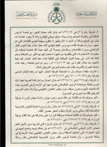 وتحدثت البرقية الموسومة تحت رقم 267 بتاريخ 14/4/1432 (20 مارس/ آذار 2011) والتي نشرها موقع "ويكيليكس" هذا الأسبوع ضمن ما قال إنها نصف مليون وثيقة سعودية عن "اتصال مراسل قناة العربية مفيدا بأنه أجرى مقابلة مع فخامة الرئيس الباكستاني تطرق فيها إلى الأوضاع في البحرين حيث أكد فخامته «أنهم يدعمون موقف دول مجلس التعاون الخليجي ويشارك خادم الحرمين قلقه مما يجري في البحرين»".