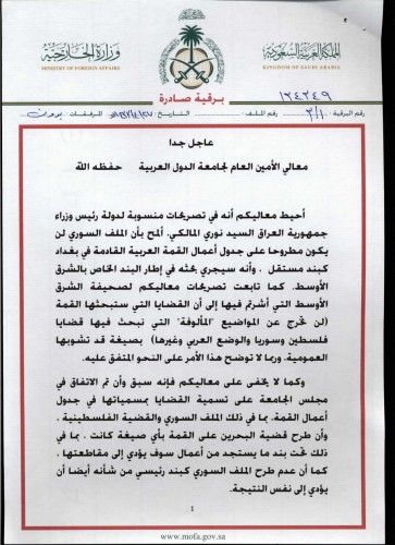 وأوضحت البرقية الموجهة إلى أمين عام الجامعة العربية نبيل العربي والمؤرخة في 27/4/1433 هـ (21 مارس/ آذار 2012) والتي تم إرسالها بأن "طرح قضية البحرين على القمة بأي صيغة كانت، بما في ذلك تحت بند ما يستجد من أعمال سوف يؤدي إلى مقاطعتها، كما أن عدم طرح الملف السوري كبند رئيسي من شأنه أيضا أن يؤدي إلى نفس النتيجة".