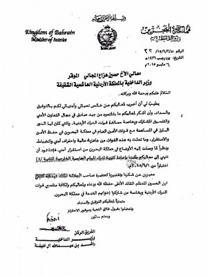 يطيب لي أن أعرب لمعاليكم عن خالص تحياتي وأمنياتي لكم بالتوفيق والسداد، وأن أشكر لمعاليكم ما بذلتموه من جهد صادق في مجال التعاون الأمني والتنسيق المشترك وبخاصة مساندة قوات الدرك الأردنية، والتي كان لها الدور البارز في المساهمة مع قوات الأمن العام في مملكة البحرين في حفظ الأمن والاستقرار، وما تحلت به هذه القوات من جاهزية عالية واحتراف أمني وانضباط. ونظراً لما وصلت إليه الأوضاع في مملكة البحرين من استقرار أمني، فإننا نود إن ننمي إلى معاليكم طلبنا بإعادة كتيبة (درك المهام الخاصة الخارجية الثانية/ ٤) اعتباراً من ١/ ٦/ ٢٠١٥م.