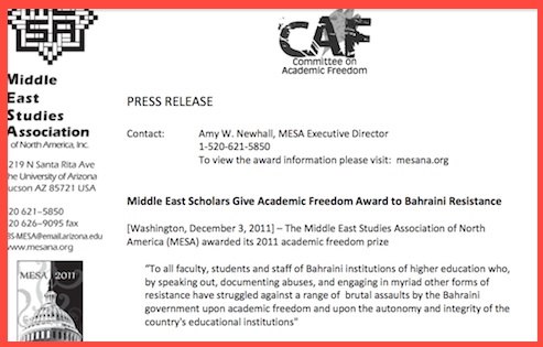 مرآة البحرين: أعلنت جمعية دراسات الشرق الأوسط في أميركا الشمالية (MESA) منح جائزتها للحرية الأكاديمية لهذا العام 2011 إلى أعضاء المؤسسات التعليمية في البحرين الذين تحدثوا عن الانتهاكات.