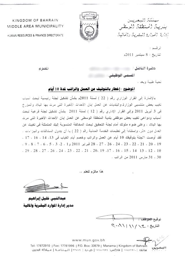 وكشفت "الوسط" أن بلدية الوسطى سلمت 57 موظفاً (من مهندسين واختصاصيين وغيرهم) من إدارة المنتزهات والتجميل إخطاراً بالتوقيف عن العمل والاقتطاع من الراتب لمدة 10 أيام، وذلك على خلفية تغيبهم عن العمل خلال فترة الأحداث التي شهدتها البحرين في شهري فبراير / شباط ومارس / آذار 2011.