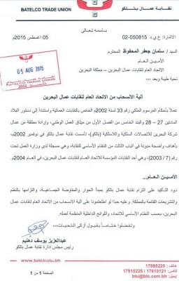 وحصلت "مرآة البحرين" على نسخة من رسالة بعثها رئيس نقابة بتكلو عبدالعزيز دهنيم، إلى الأمين العام للاتحاد العام لنقابات عمال البحرين السيد سلمان المحفوظ، يسأله فيها بشكل رسمي عن آلية الانسحاب من الاتحاد العام لنقابات عمال البحرين، وهو ما يبدوا خطوة تمهيدية للانفصال من جانب نقابة بتلكو.
