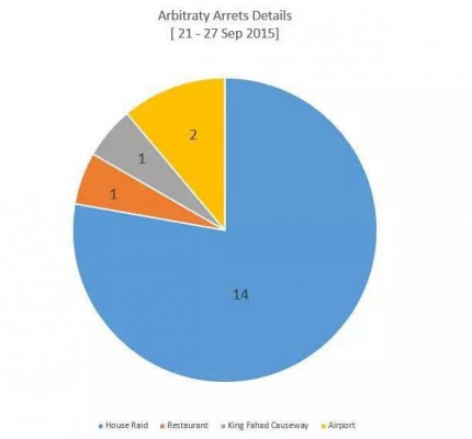 مرآة البحرين: قال مركز البحرين لحقوق الإنسان إنه رصد في خلال الفترة من (20 إلى 27 سبتمبر/ أيلول 2015) نحو 18 حالة اعتقال تعسفي من بينها 4 حالات لأطفال، كما تم الإفراج عن شخصين من بين الإحصائية المرصودة. وأوضح في بيان أمس الاثنين بأنه "تم اعتقال 14 شخص من خلال مداهمة منازلهم و شخصين من مطار البحرين الدولي و شخص واحد من جسر الملك فهد وشخص آخر من أحد المطاعم".