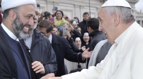 مسئول الحريات الدينية بمرصد البحرين الشيخ ميثم السلمان مصافحاً البابا فرنسيس
