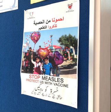 مرآة البحرين: قالت صحيفة الوسط إن بعض المراكز الصحية نشرت إعلاناً باللغة الباكستانية - البلوشية يطلب من الجميع التطعيم ضد الحصبة تحت عنوان «احمونا من الحصبة... تذكروا التطعيم»، لتعلن عن توافر التطعيم لمن لم يتلقَّ التطعيم.