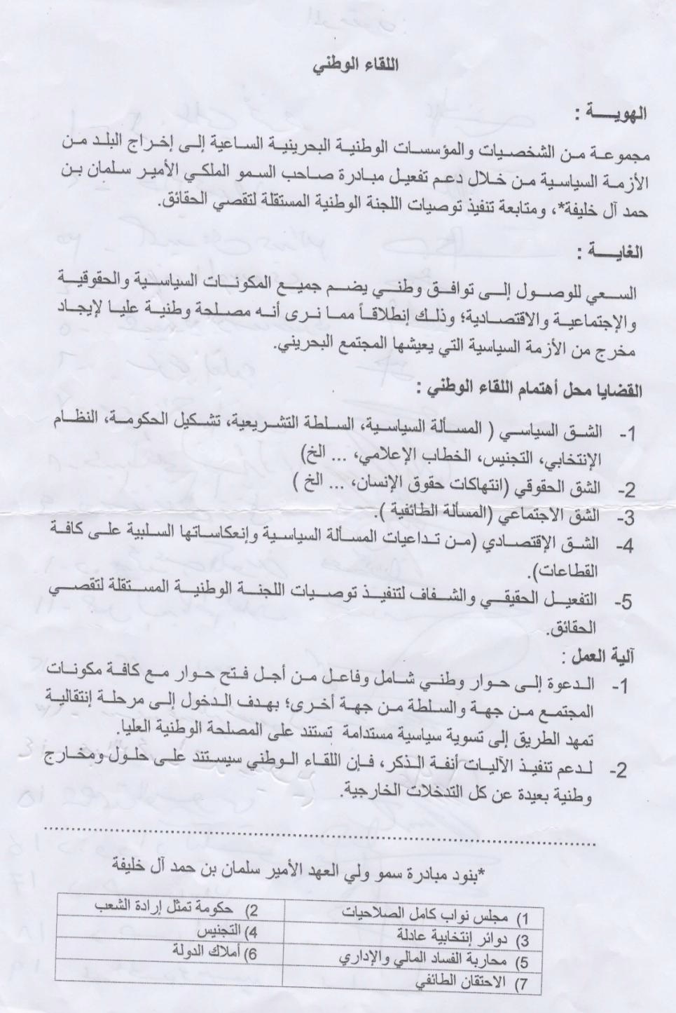 وحصلت "مرآة البحرين" على ورقة تتضمن بنود اللقاء الذي يسعى بحسب الشخصيات الموقعة على ورقته "للوصول إلى توافق وطني يضم جميع المكونات السياسية والحقوقية والإجتماعية والإقتصادية، وذلك انطلاقاً مما نرى أنه مصلحة عليا لإيجاد مخرج من الأزمة السياسية التي يعيشها المجتمع البحريني". وتركز الورقة في الشق السياسي (المسألة السياسية) على إصلاح السلطة التشريعية، تشكيل الحكومة، النظام الإنتخابي، التجنيس والخطاب الإعلامي، فيما تشير في الشق الحقوقي إلى انتهاكات حقوق الإنسان، وإلى المسألة الطائفية في الشق الإجتماعي، في حين يتضمن شقها الإقتصادي معالجة تداعيات المسألة السياسية وانعكاساتها السلبية على القطاعات كافة".