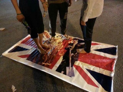 مرآة البحرين: أشغل غاضبون بحرينيون (الاثنين 16 نوفمبر/ تشرين الثاني 2015) النار في صور رئيس الوزراء البريطاني ديفيد كاميرون احتجاجا على إنشاء قاعدة عسكرية في البحرين.