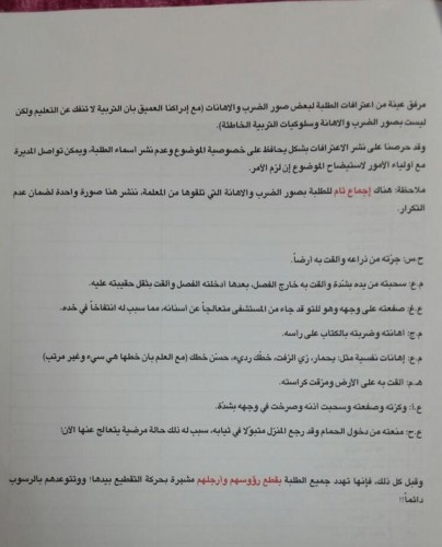 وقالت نائبة رئيس جمعية المعلمين جليلة السلمان إن وافدة أردنية بابتدائية الدير للبنين تضرب طلبة الصف الأول وتسبب لهم الذعر والخوف حتى صاروا يرفضون الذهاب للمدرسة، مؤكدة أنهم تقدموا بشكوى مكتوبة لإدارة المدرسة بعد أن تحولت إلى معسكر للضرب.