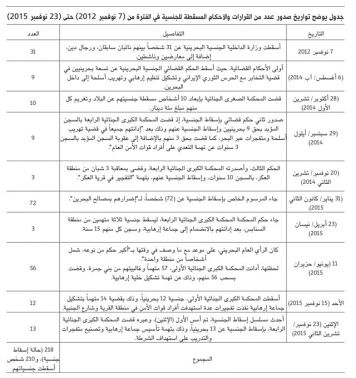 وبدا لافتاً - وفق الصحيفة - "استمرار تسجيل العامين 2014 و2015، صدور الأحكام والقرارات الخاصة بإسقاط الجنسية، ففي (31 يناير/ كانون الثاني 2015)، جاء المرسوم الخاص بإسقاط الجنسية عن (72) شخصاً، لإضرارهم بمصالح البحرين، الغالبية منهم تتواجد خارج البحرين (50 شخصاً)، فيما تضمنت القائمة أسماء لأشخاص منتمين لتنظيم «داعش»".