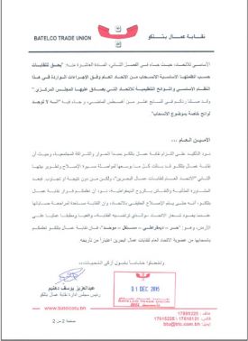 وجاء في نص خطاب النقابة «إن نقابة عمال بتلكو وبعد المشاورات المتأنية والنقاش بالروح الديمقراطية، تعلن انسحابها من عضوية الاتحاد العام لنقابات عمال البحرين».