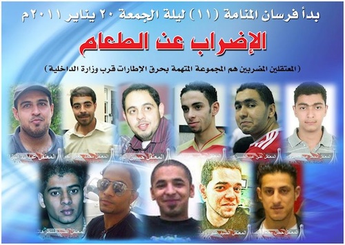 مرآة البحرين (خاص): معتقلو المنامة الـ11، المتهمون بقضية حرق الإطارات، بدأوا إضراباً مفتوحاً عن الطعام منذ مساء أمس الخميس 19 يناير 2012 مطالبين بالإفراج عنهم بعد أكثر من 65 يوماً قضوها تحت ذمة التحقيق داخل المعتقل.