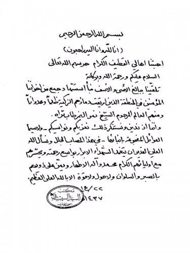وجاء نص التعزية «أحبتنا أهالي القطيف حرسهم الله تعالى، السلام عليكم ورحمة الله وبركاته، تلقينا ببالغ الأسى والأسف، نبأ استشهاد جمع من إخواننا المؤمنين في المنطقة، الذين أريقت دماؤهم الزكية ظلماً وعدواناً، ومنهم العالم المرحوم الشيخ نمر النمر طاب ثراه».