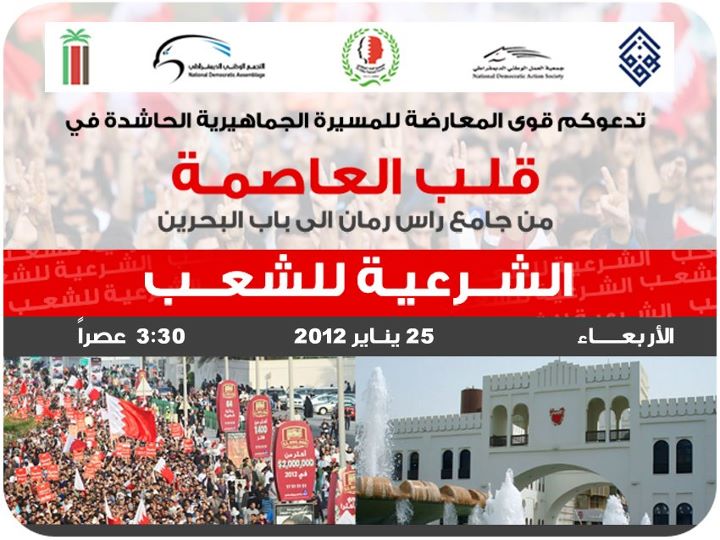 وكان رئيس الأمن العام قد أصدر بياناً اليوم قال فيه إن "جمعية الوفاق، عادت مجددا وتقدمت بإخطار إلى مديرية شرطة محافظة العاصمة لتنظيم مسيرة باسم عدد من الجمعيات السياسية وذلك بوسط المنامة في المنطقة الواقعة ما بين جامع رأس رمان وباب البحرين، عصر الأربعاء 25 يناير/ كانون الثاني 2012".
