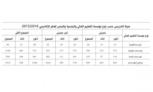 مرآة البحرين: بينت أرقام مجلس التعليم العالي للعام الأكاديمي الماضي 2014/ 2015، أن عدد أعضاء هيئة التدريس من غير البحرينيين العاملين في الجامعات الحكومية والخاصة والإقليمية بمملكة البحرين يصل إلى 1016، (710 من الذكور و306 من الإناث)، فيما لا يتجاوز عدد البحرينيين من هيئة التدريس في الجامعات الـ 899 (403 من الإناث و496 من الذكور).