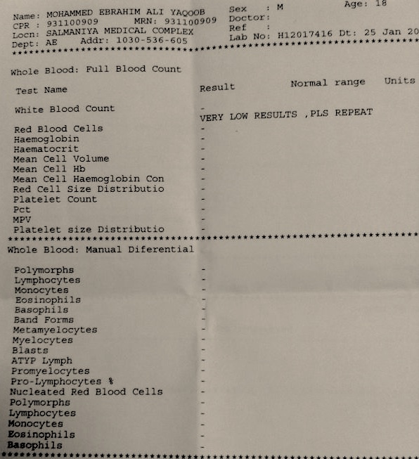 مرآة البحرين (خاص): حصلت "مرآة البحرين" على نتائج التحليلات التي أجريت للشهيد الشاب محمد إبراهيم يعقوب (18 عاما) في مستشفى السلمانية الذي نقل إليه يوم الأربعاء الماضي بعد دهسه وضربه من قبل قوات الأمن.