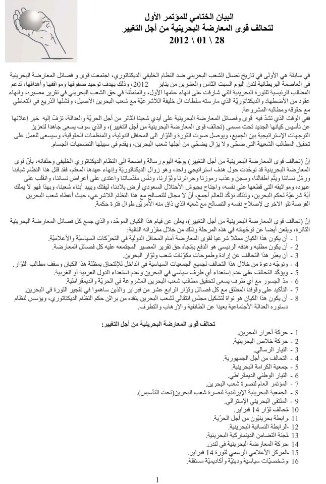 وضم التشكيل الجديد الذي وصف بأنه "سابقة أولى في تاريخ نضال الشعب البحريني ضد النظام" أغلبية قوى المعارضة استثناء الجمعيات السياسية المرخصة. وأضاف البيان "اجتمعت قوى و فصائل المعارضة البحرينية في العاصمة البريطانية لندن بهدف توحيد صفوفها ومواقفها وأهدافها، لدعم المطالب الرئيسية للثورة البحرينية التي شارفت على إنهاء عامها الأول".