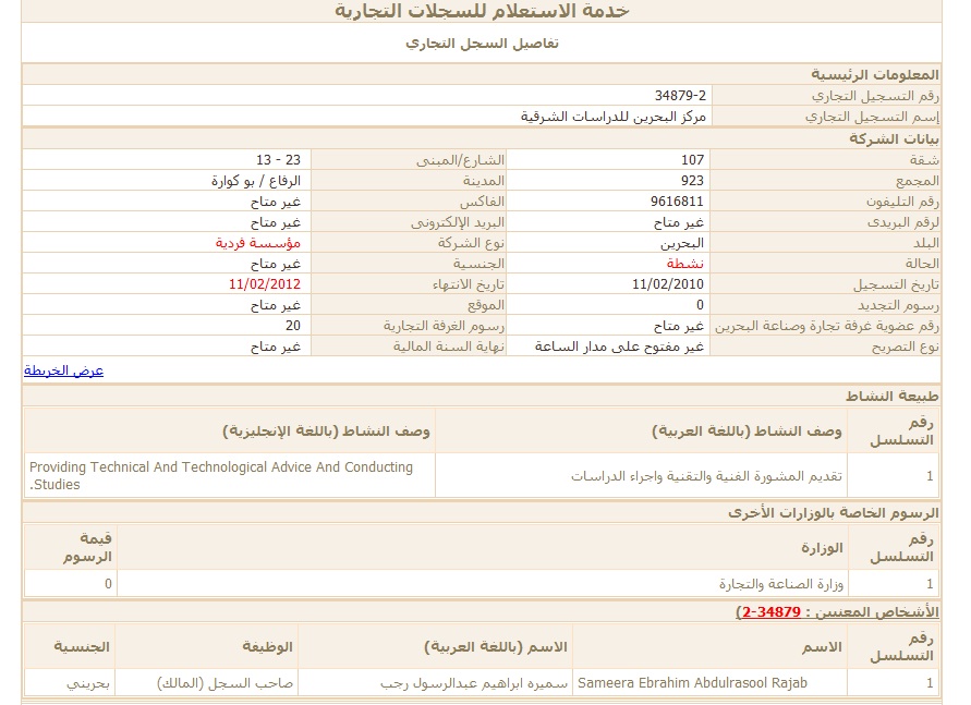 وتفيد خدمة الاستعلام للسجلات التجارية التابعة إلى وزارة التجارة والصناعة - راجع الصورة المرفقة رقم (2) - بأن مركز البحرين للدراسات الشرقية الذي تم تأسيسه العام الماضي 12 فبراير/ شباط 2011 أنه "مؤسسة فردية" مسجلة تحت اسم سميرة إبراهيم عبدالرسول رجب، وأن مقرها في بوكوارة بمنطقة الرفاع. ولايتضمن وصف النشاط الخاص بالمؤسسة أي خدمات تتعلق بالجانب الإعلامي، حيث ينص السجل التجاري الخاص بها أن نشاطها ينحصر في "تقديم المشورة الفنية والتقنية وإجراء الدراسات" على ما تبين خدمة السجلات التجارية.
