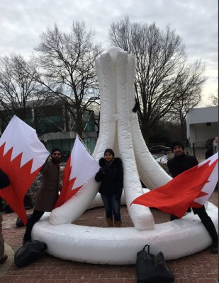 البالون الأبيض الذي يربو حجمه على 12 قدم نُصب أمام السفارة البحرينية في "واشنطن" أمس الجمعة (12 فبراير/ شباط 2016) وشكل خلفية لاعتصام قاده نشطاء حقوقيون بارزون بمناسبة الذكرى السنوية الخامسة لاندلاع شرارة الاحتجاجات. هتافات كثيرة رددت خلال الاعتصام الذي دام حوالي الساعة وسط موجة من البرد الشديد الذي ضرب العاصمة الأمريكية، مثل "أفرجوا عن الصحافيين في البحرين" و"أوقفوا التعذيب في البحرين" و"أطلقوا سراح السجناء السياسيين في البحرين".