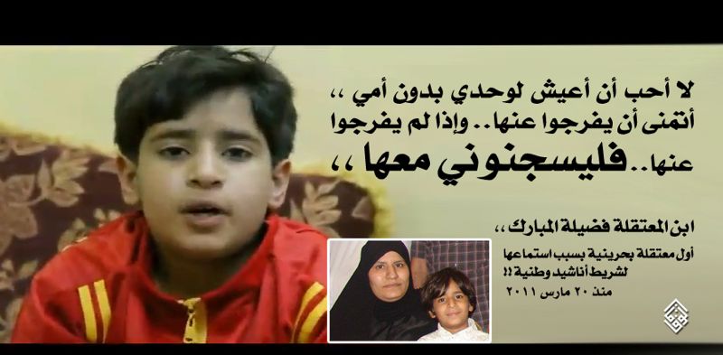 مرآة البحرين: ناشد ابن المعتقلة فضيلة المبارك إطلاق سراح والدته المعتقلة منذ 20 مارس/آذار 2011 بسبب "استماعها إلى أناشيد وطنية".