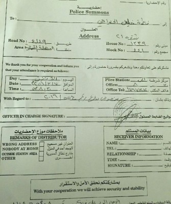 ووفق الإحضارية التي حصلت مرآة البحرين على نسخة منها، فإن السلطات طلبت من الحلواجي التواجد في مكتب رقم  8 بمركز شرطة الحد عند الثامنة والنصف صباحاً، معللة الحضور بسبب البلاغ رقم 554 لسنة 2016.