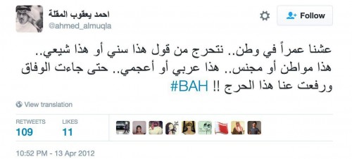 مرآة البحرين (خاص): في أحد تعليقاته التي تعود إلى العام 2012 يصرّح المخرج البحريني أحمد يعقوب المقلة بأن جمعية "الوفاق" رفعت عنه الحرج من القول إن هذا سني أو هذا شيعي (شاهد الصور). لا يقول المقلة في تعليقاته التي نشرها على حسابه الشخصي في "تويتر" ما معنى أن الحرج قد تم رفعه عنه أو كيف سيتصرّف بإزاء هذا الموقف المستجد. لكننا صرنا نعرف الآن، أيّ نوع من الحرج الذي رُفع عنه آنئذ.