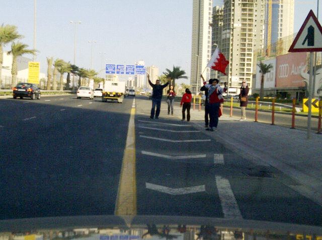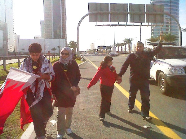 من جهة أخرى سارت فتاة ملثمة بمفردها إلى مدخل آخر لدوار اللؤلؤة حاملة القرآن الكريم وعلم البحرين، فيما رشحت أنباء عن نزول 4 شبان إلى الدوار من جهة أخرى وإيساعهم ضربا قبل اعتقالهم.