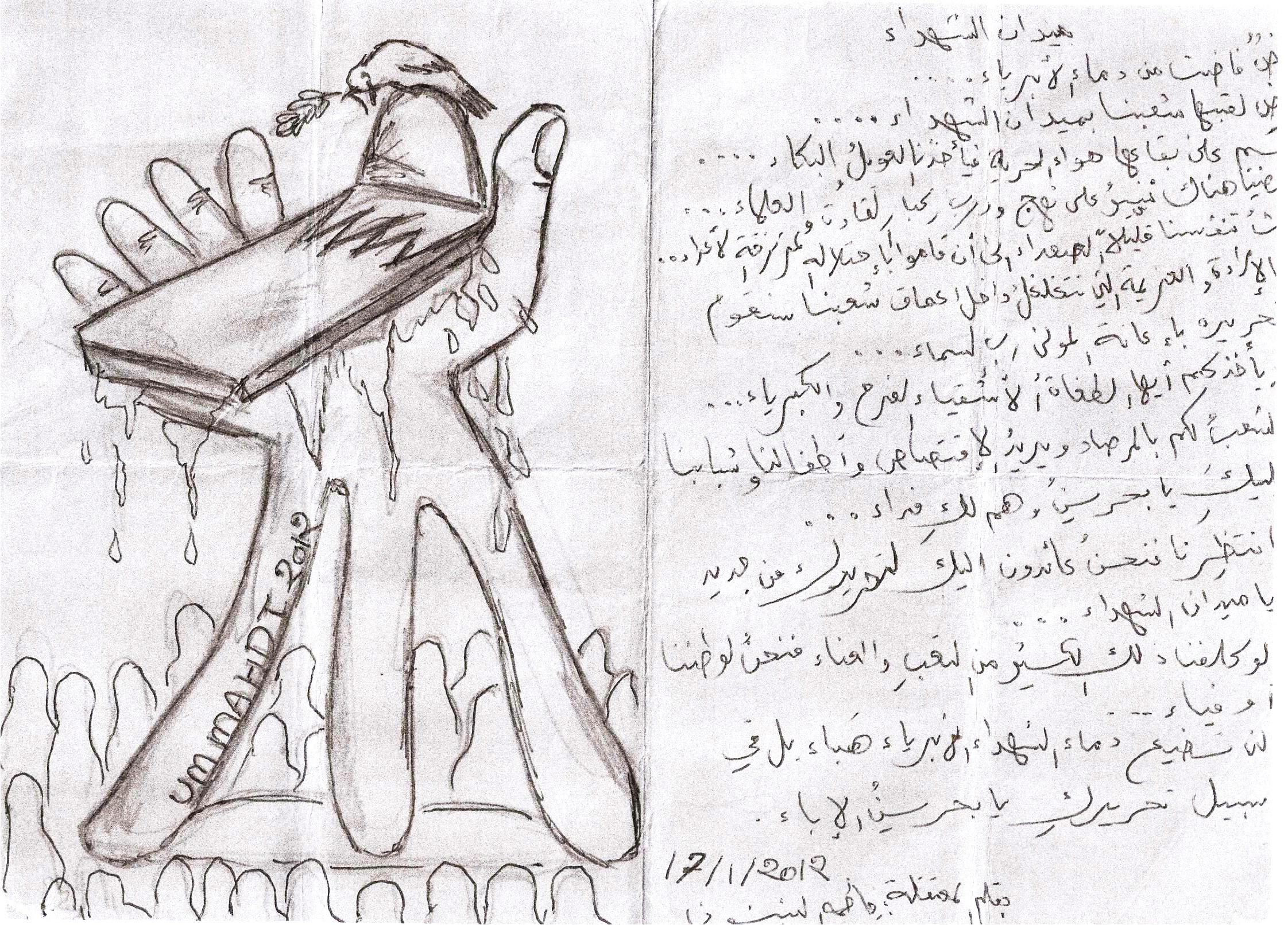 أما (أحمد.ع.م)، فكتب إلى زوجته في الخامس من فبراير الجاري، في كارتونة صغيرة "تذكرين العام الماضي، أحيينا مولد النبي محمد (ص) في ميدان الشهداء، كوني من أوائل العائدين إلى الدوّار حبيبتي، وتذكريني، سأعود حتماً وسنجلس معاً في الدوّار".