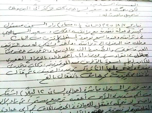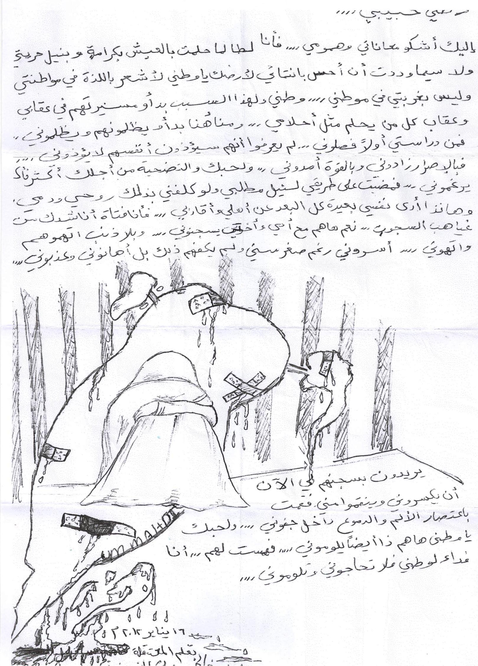 "أصدقائي، سامحوني لأنكم تجاهدون في ساحات القرية ليلياً ضدّ المرتزقة، أما أنا فقد صرتُ هنا في السجن، أدعو الله أن يفكّ أسري لأكون معكم" (حسين، 23 ديسمبر 2011، الحوض الجاف).