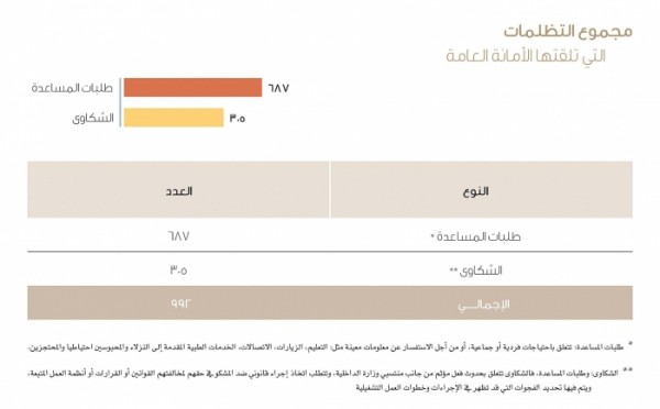 وأكدت الأمانة أن التظلمات المقدمة إليها في الفترة التي رصدها التقرير سجلت زيادة مجددًا، حيث بلغت تسعمائة واثنتين وتسعين (992) شكوى وطلب مساعدة، وذلك بنسبة زيادة بلغت أكثر من (9 %) مقارنة بالعدد في العام الذي سبقه، وقد تمت تسوية نحو (94 %) من طلبات المساعدة التي تلقتها الأمانة العامة، ولاسيما الواردة من نزلاء أو محبوسين أو من ذويهم في موضوعات مثل: الرعاية الصحية، تلقي الزيارات، إجراء الاتصالات الهاتفية، استكمال التعليم... وغيرها من الطلبات الفردية الأخرى.