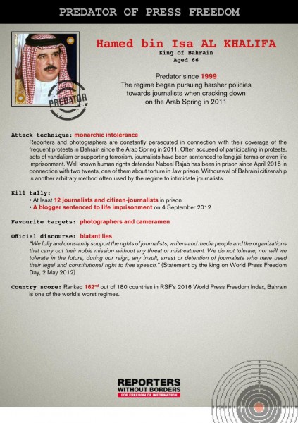 Bahrain King on RSF New List of Press Freedom Predators