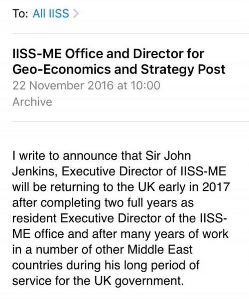 ولم يعلن المركز رسميا استقالة رئيسه التنفيذي لفرع المنامة، لكن موقع «بز فيد» الإخباري، قال إن السفير البريطاني السابق في السعودية، جون جينكينز، استقال بهدوء من منصبه كرئيس للمركز نهاية نوفمبر/تشرين الثاني الماضي، وذلك بحسب رسالة داخلية اطّلع عليها الموقع.