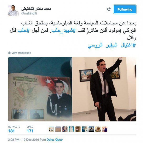 وعاد الشنقيطي لكي يحذف عدداً من التغريدات التي أدلى بها. وقال "نصحني بعض الأحبة بحذف بعض تغريداتي عن اغتيال السفير الروسي حتى لا يُساء فهمُها شرعيا أو سياسيا فحذفتُها تقديراً لنصحهم ولسداد رأيهم".
