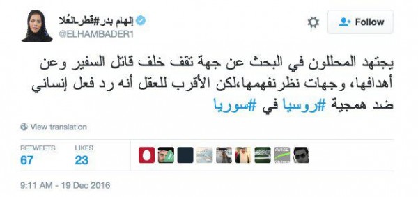 وقالت الإعلامية القطرية إلهام بدر في حسابها على شبكة التواصل الاجتماعي تويتر "يجتهد المحللون في البحث عن جهة تقف خلف قاتل السفير وعن أهدافها، لكن الأقرب للعقل أنه رد فعل إنساني ضد همجية روسيا في سوريا".