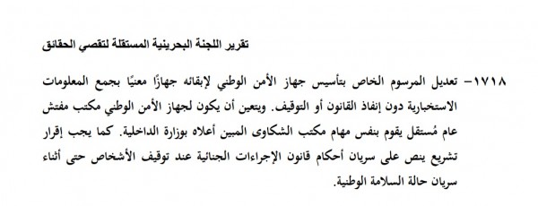 ويتناقض المرسوم مع الفقرة 1718 من توصيات اللجنة البحرينية المستقلة لتقصي الحقائق (لجنة بسيوني)، التي نصت صراحة على ضرورة اقتصار عمل جهاز الأمن الوطني في البحرين على جمع المعلومات دون إنفاذ القانون أو توقيف المشتبه بهم.