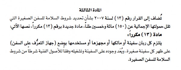 ونص القرار أن يلتزم كل ربان سفينة أو مالكها أو مجهزها أو مستخدمها بوضع جهاز التعرف على السفن على ظهر كل سفينة صغيرة ويعد وجوده على السفينة وتشغيله وفقا للأصول الفنية شرطا من شروط السلامة للسفن الصغيرة.